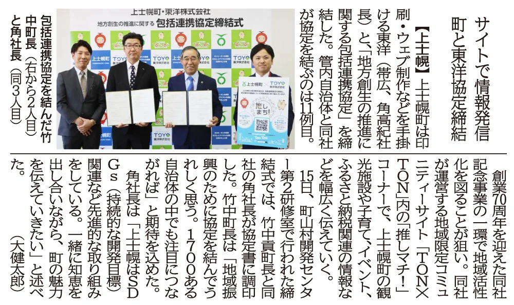 北海道音更町(町長:小野 信次)と東洋株式会社(代表取締役社長:角 高紀)は、包括的な連携のもと相互に協力し、情報発信力を強化することで地域活性化および地域経済に寄与することを目的に包括連携協定を締結いたしました。