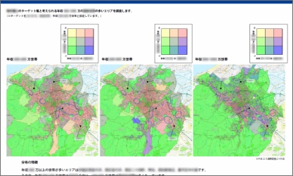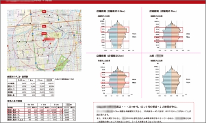 指定エリア (既存店舗周辺または新規出店候補など)にいるターゲット層の分布を可視化した資料を作成できます。