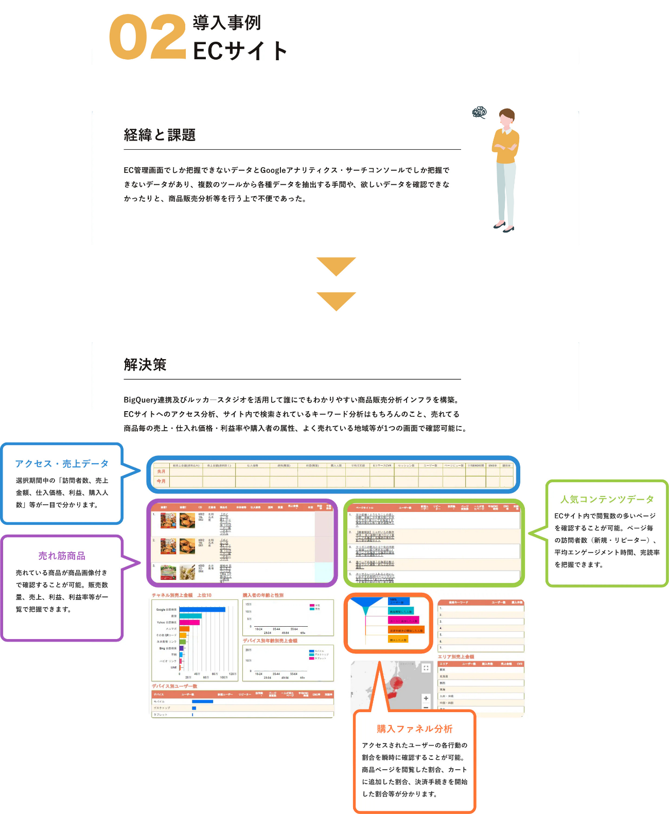 Googleアナリティクスや広告データ、メールマガジン、ECサイトの売上、店舗のPOSデータなど、形式の異なるあらゆるデータをLooker StudioやBigQueryを用いて一元管理化します。