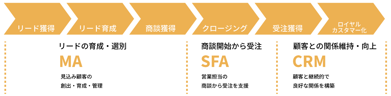 顧客にとっても自分にマッチした商品の情報を、的確なタイミングで届けてくれることはメリットです。 MA・SFA・CRMツールは自社・顧客双方にとってメリットがあり、また、効率的な営業活動を行うための仕組みづくりの手助けをしてくれます。
