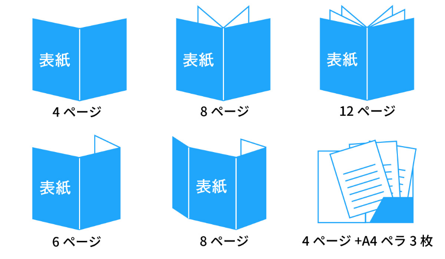 パンフレットのページ数は数ページのものから数十ページのものまでさまざまです。このほかにもさまざまなパターンで制作することが可能です