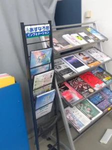 垂れ幕を、離れたところからでもはっきりわかるような色合いにしました。また遊学館の発行物と区別がつくように、あすなろ会専用のパンフレットラックを設置しました。