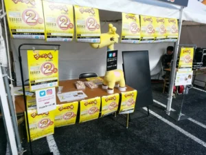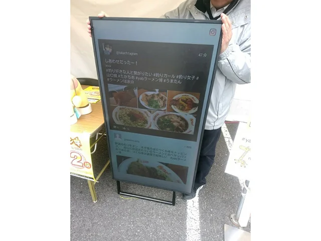 山口県で行われた「ラーメン博」のブース内ディスプレイにおいて、SNS(X/インスタグラム)のハッシュタグ投稿をリアルタイムでサイネージに表示するSNSサイネージシステムを採用いただき、実施いたしました。