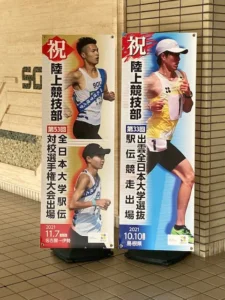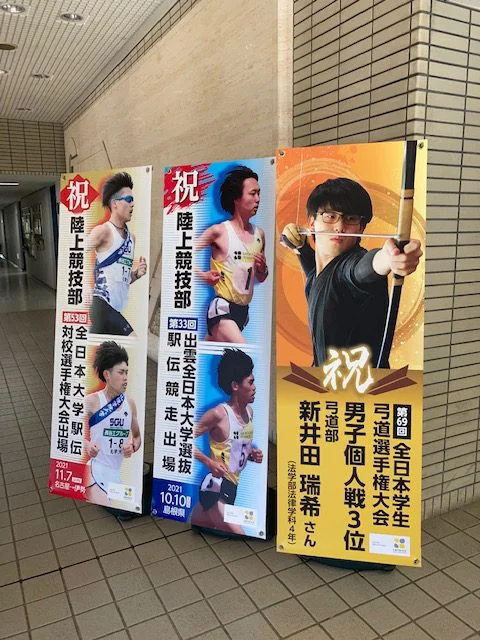 スポーツの分野でも北海道の代表として目覚ましい活躍を果たしている札幌学院大学の学生たち。その功績を称える手法は、一般的には校舎の壁に「祝○○全国大会出場」と文字だけの懸垂幕が下がっているのをよく見ますが、頑張った学生にもっと脚光を当てて称えたいという大学のご意向を反映させ、注目度の高いバナーをデザインして自立スタンドとセットでご提案いたしました。その数はこれからもどんどん増えていくことでしょう。