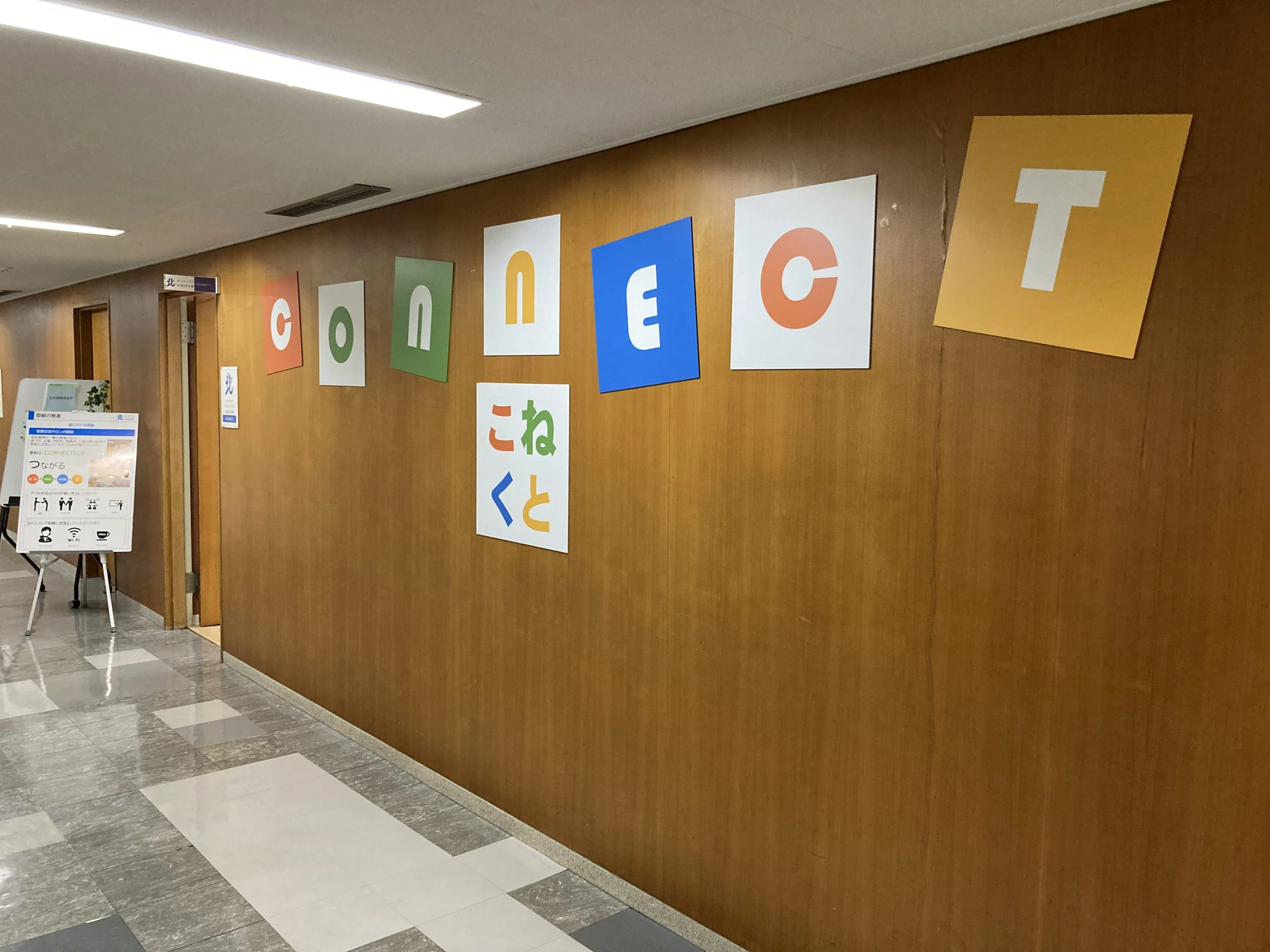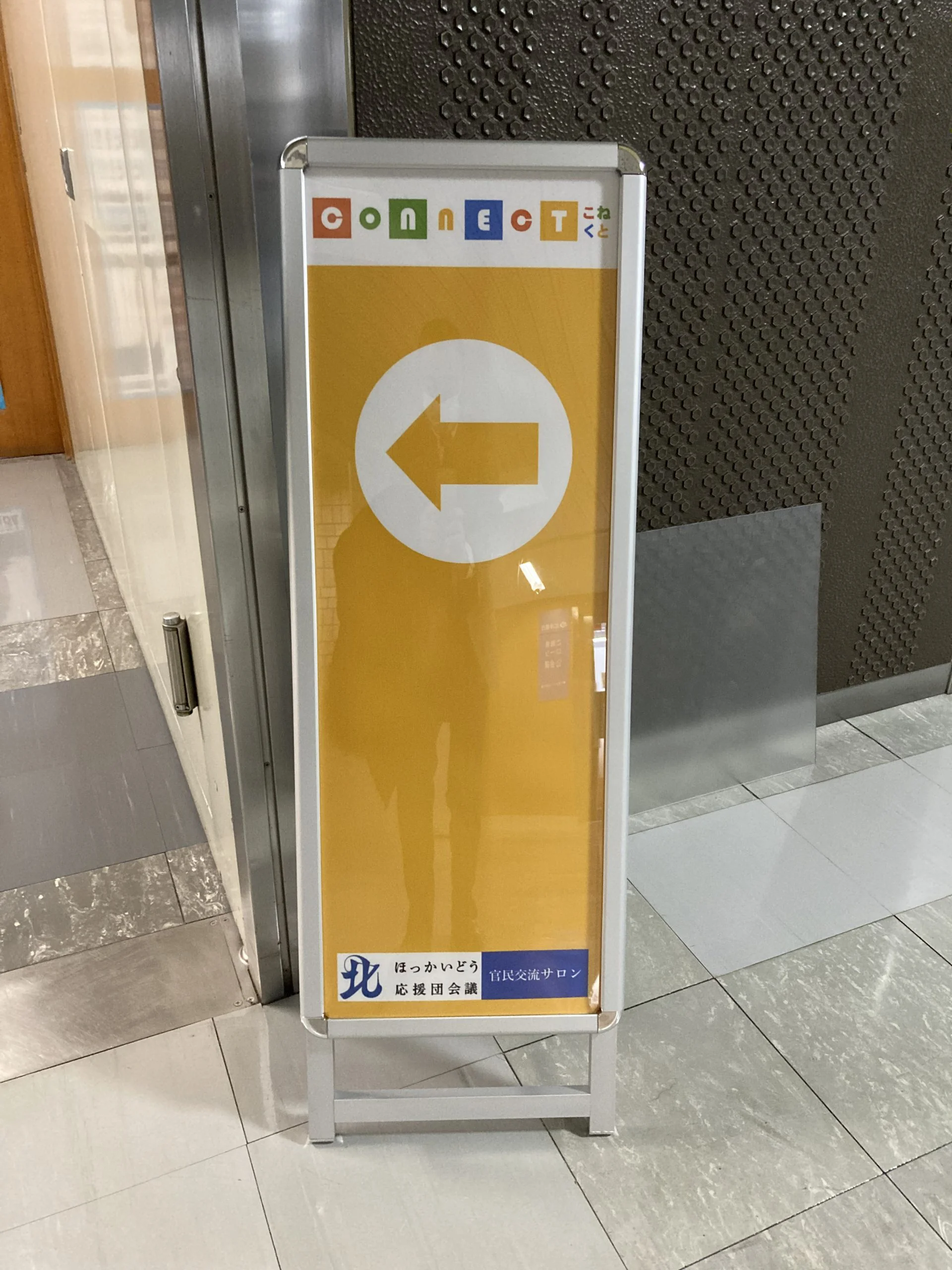 2023年9月5日に北海道が道庁内に開設した、企業や市町村、地域おこし協力隊の皆様が気軽に交流する場、官民交流サロン「CONNECT(こねくと)」を庁舎内で分かりやすくアピールし、誘導するためのサインを設置したい。